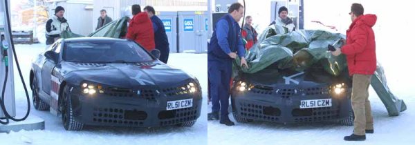 "Der getarnte Prototyp absolviert Testfahrten bei Eis und Schnee. Klick, klick - Erlkönig-Jäger Hans G. Lehman hat ihn für Bild.de erwischt. Genau in dem Moment, als zum Tanken kurz mal die Plane gelüftet wird":