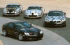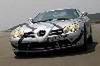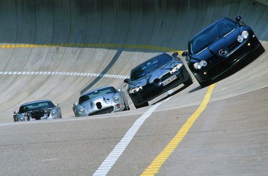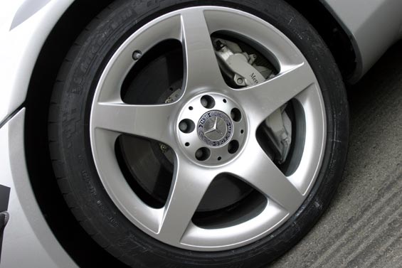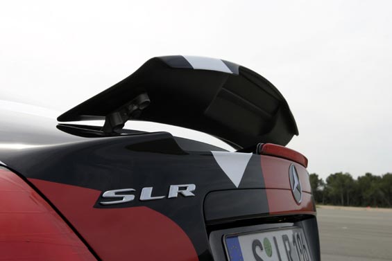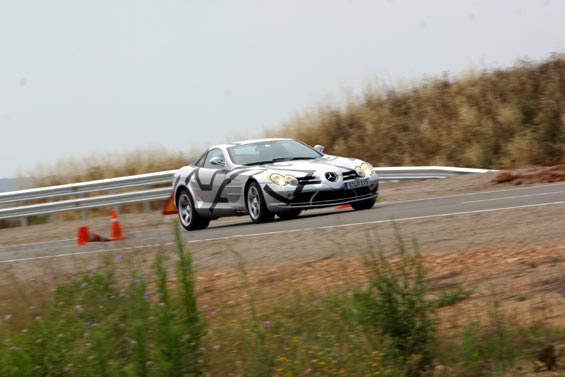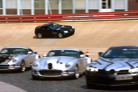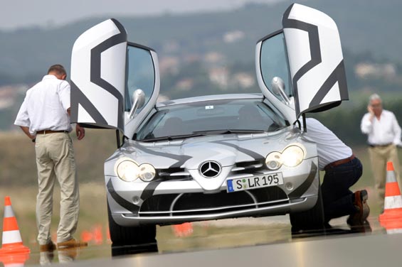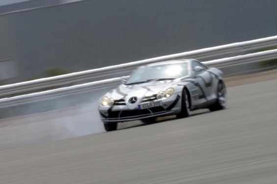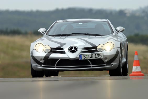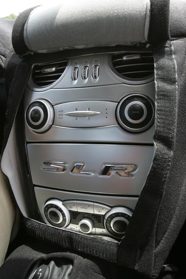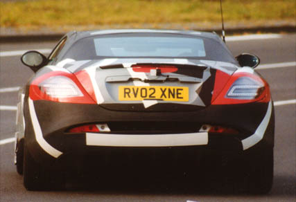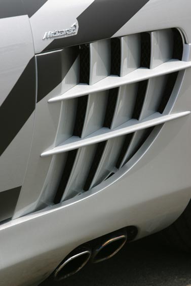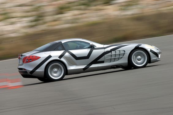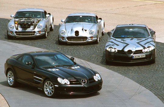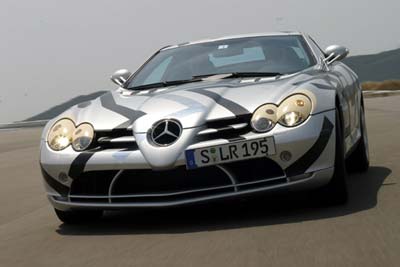 Comfortably over 200mph, over 600bhp and torque 700 to 800Nm... Front-mid-engine layout with charge-cooling. The SLR's engine is also an AMG production (as SL 55 AMG), derived from the existing 24-valve, 5439cc, supercharged V8; but now with an all-new dry-sump lubrication. It drives through a five-speed automatic transmission taken from the Maybach (it's big enough to handle all that torque) but reprogrammed with AMG Speedshift R. The SLR has a Carbonfibre monococque and a hefty pair of triangulated cast-aluminium front frames to hold the engine and the front suspension in place. Behind the front wheels are giant air-exit vents like those of a Gullwing SL, below these vents are a pair, on each side, of exhaust pipes echoing those of the SLR race car in which Stirling Moss and Denis Jenkinson won the 1955 Mille Miglia. This prototype has 18-inch OZ wheels shod with 245/40 front tyres and 295/35 rears. Even when the tail pushes out through bends, the SLR's supreme balance allows you to retain control. Rear flap rises by up to 45 degrees under heavy braking to increase downforce and improve stability. One final thought. The likely price is about £250,000. Compared with its recent rivals, that's almost a bargain.