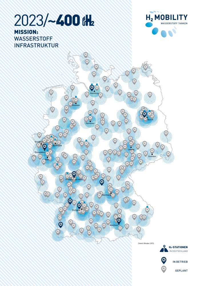 Bis zum Jahr 2023 sieht der Aktionsplan von H2 MOBILITY für das Bundesgebiet ein flächendeckendes Netzwerk von H2-Stationen vor. Deutschland wäre damit das erste Land, das über ein überregionales Netz zur Betankung von Brennstoffzellenfahrzeugen mit Wasserstoff verfügt. Dazu sind Investitionen von insgesamt rund 400 Millionen Euro geplant.
